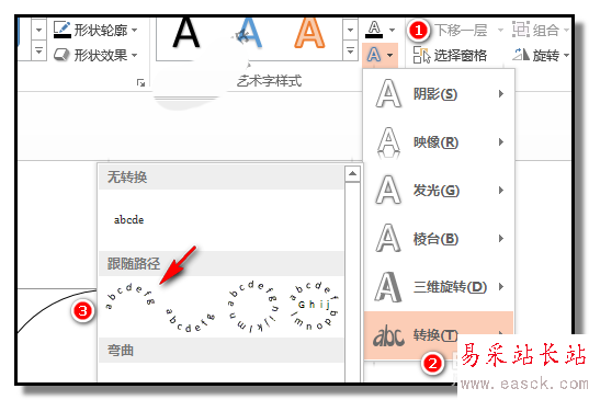 4、下方彈出的菜單;鼠標放在最后一個“轉換”,即彈出一個面板,點選“跟隨路徑”的第一個“上彎弧”。
