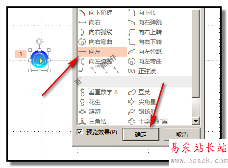 4、點下右邊的小球,選中小球;再點下“動畫”選項卡;再在“添加動畫”命令這里點下小三角。接著,重復步驟3,調出“添加動作路徑”對話框,在框中,點“向左”路徑,再點確定。