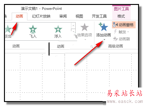 2、先制作兩個小球對碰動畫;鼠標點下左邊的小球,選中小球;再點下“動畫”選項卡;再在“添加動畫”命令這里點下小三角。