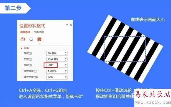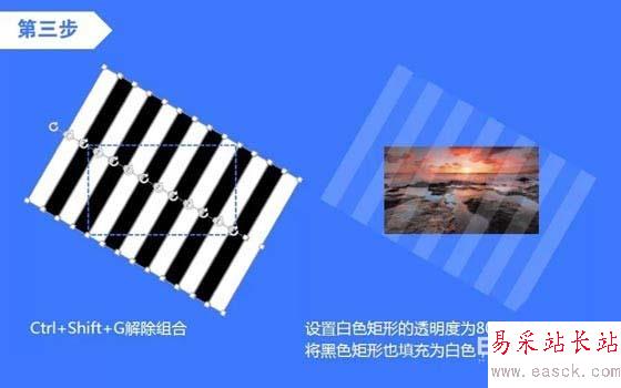 3、斜條紋半透明處理 Ctrl+Shift+G解除組合,設置白色矩形的透明度為80%,將黑色矩形也填充為白色,透明度為95%。