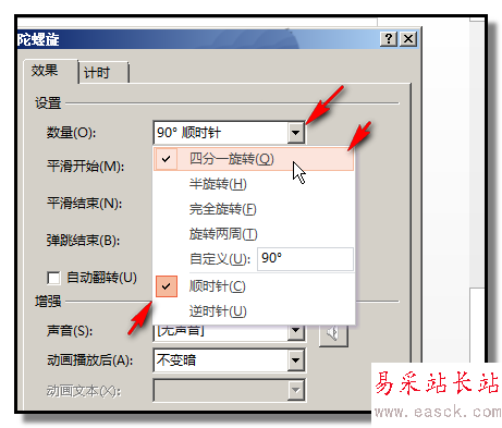 8、接著,彈出一個操作框,如下圖所示,點下小三角,彈出的菜單中選:順時針和四分之一旋轉;記得點確定。