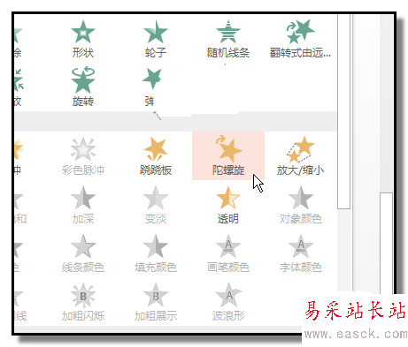7、彈出的面板中,點選“陀螺旋”;然后,再點“動畫窗格”,右邊彈出小窗口,如本步驟第二張圖所示,點下小三角,彈出的菜單中再點“效果選項”