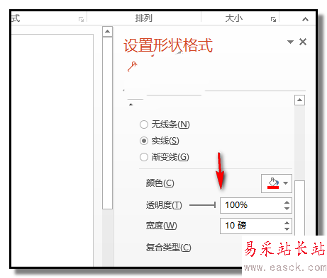 4、鼠標點下后面這個箭頭,選中此箭頭,并把箭頭設置為100%透明度;箭頭變成透明,看不到。