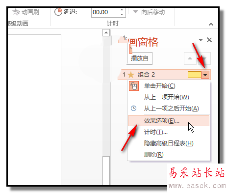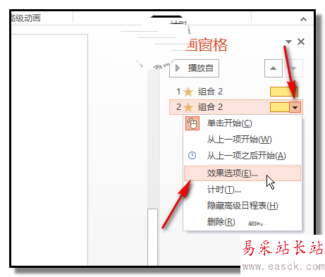 9、再點“添加動畫”并選“陀螺旋”;在”動畫窗格"這里,如下圖所示,點下小三角,彈出的菜單中再點“效果選項”。接著,彈出一個操作框,如本步驟第二張圖所示,點下小三角,彈出的菜單中選:逆時針和四分之一旋轉;記得點確定。