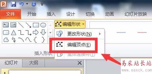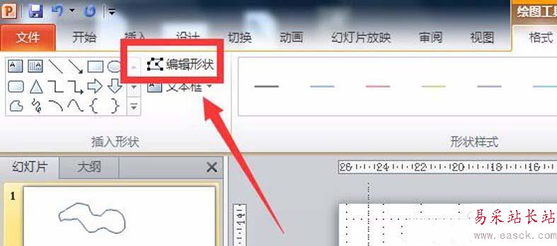 2、待打開“格式”編輯對話框之后,在“格式”編輯對話框即可看到“編輯形狀”功能,點擊“編輯形狀”即可找到“編輯頂點”功能,點擊該功能,此時圖形就變成多點連線的模式了,如圖