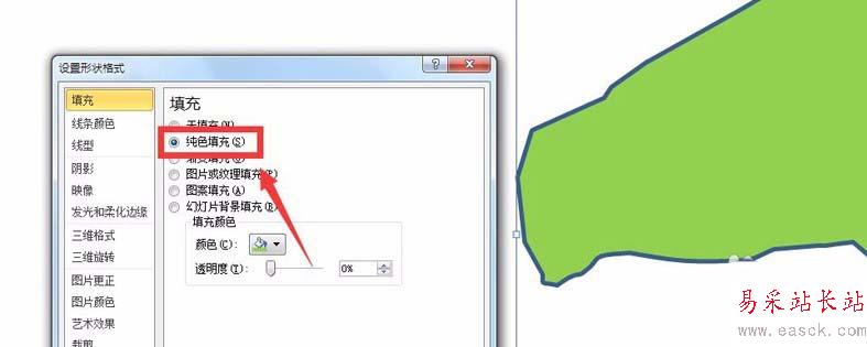 4、待圖形閉合之后,如何判斷是否是真正的閉合呢,可以選中圖形,點擊鼠標右鍵,在右鍵菜單選擇“設置形狀格式”,進入“設置形狀格式”窗口后,設置填充為有顏色填充,之后確定,檢查圖形能否正常完整填充,如果正常完整填充,說明閉合正常,如圖