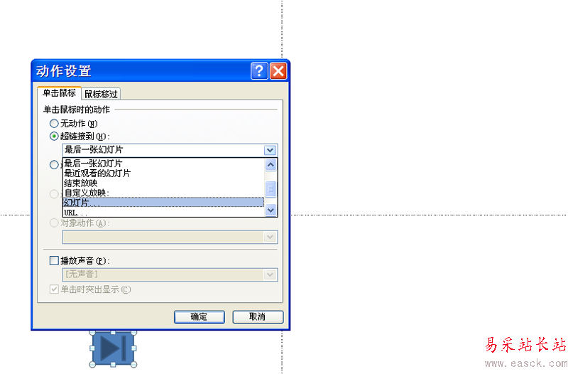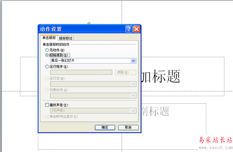 3、在動作設(shè)置對話框中切換到單擊鼠標選項卡,設(shè)置超鏈接到為“張幻燈片”。