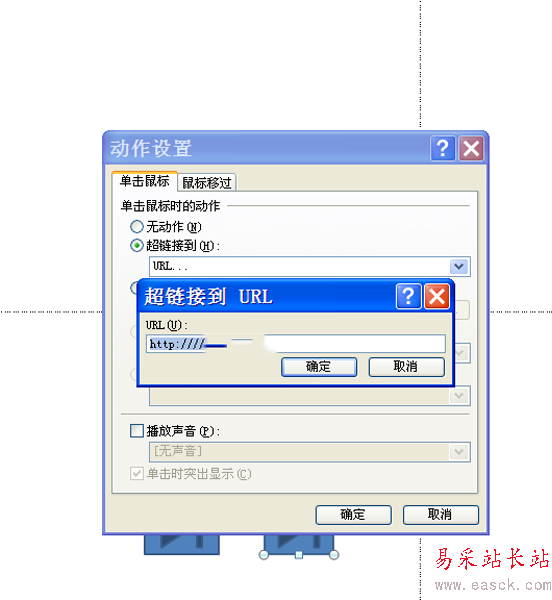 6、設(shè)置超鏈接到為url,在彈出的對話框中輸入網(wǎng)址,點擊確定按鈕,按f5播放點擊按鈕查看效果。