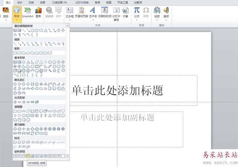1、啟動ppt2010,執(zhí)行插入-形狀命令,從菜單中選擇動作按鈕中結(jié)束按鈕。