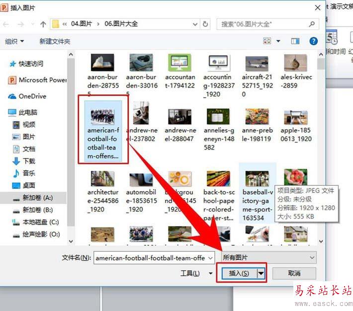 2、選中圖片。找到需要插入的圖片存儲位置,然后點擊鼠標左鍵選中圖片,然后點擊插入對話框下方的【插入】。