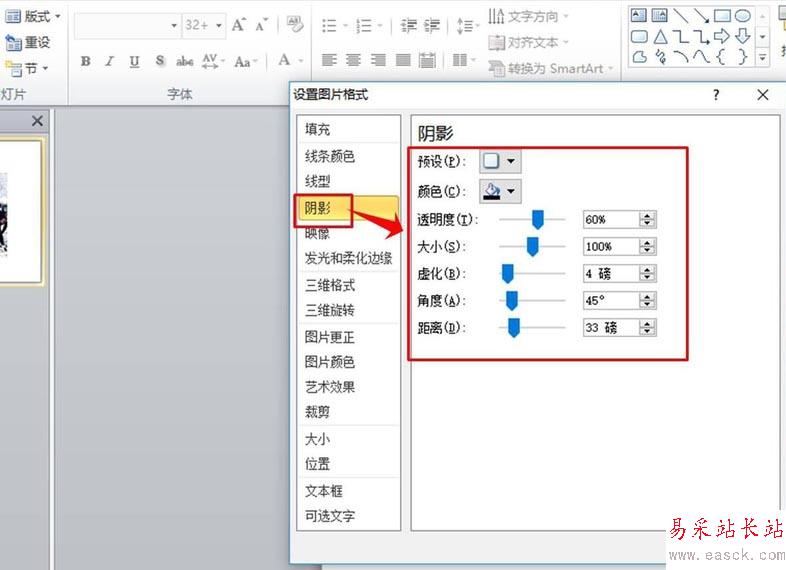 6、設置圖片格式。在“設置圖片格式”窗口左側菜單欄中選擇【陰影】,然后再在右側標識的區域內對顏色、透明度、大小、虛化、角度、距離等參數進行調整和設置,設置完成后點擊下方的【關閉】。