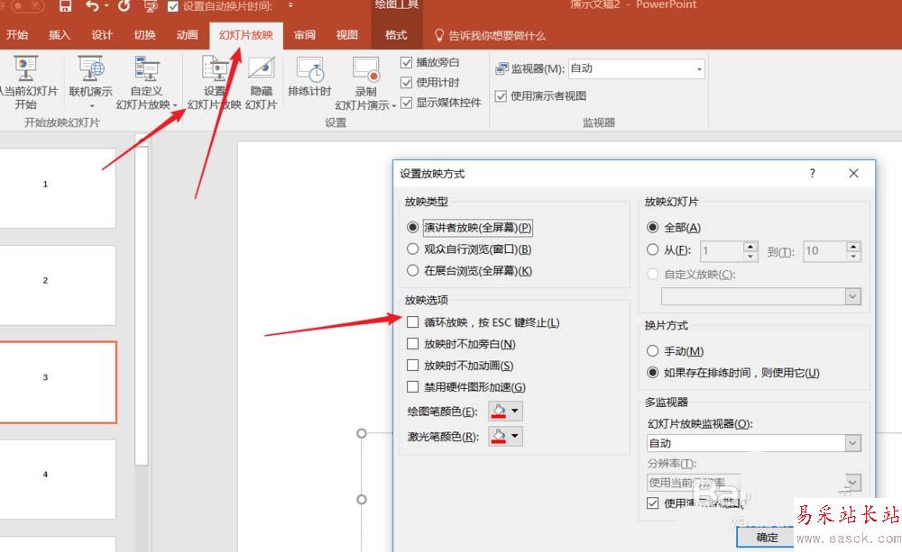 7、然后在幻燈片放映設置循環(huán)即可完成,當然背景等大家可以自己去設置,我們點擊鼠標或者是按下ESC即可停止,希望能夠對大家有幫助。