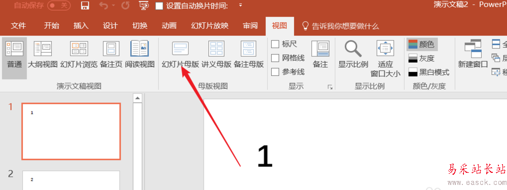 4、這時候,我們會發(fā)現我們前面的數字都展示在每個PPT頁面中,然后選擇視圖中的幻燈片母版,如下圖所示。