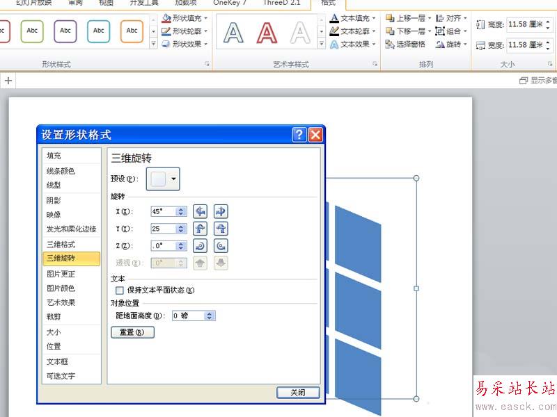 5、切換到三維旋轉(zhuǎn)選項(xiàng)卡,設(shè)置x旋轉(zhuǎn)45,y旋轉(zhuǎn)25,點(diǎn)擊關(guān)閉按鈕。