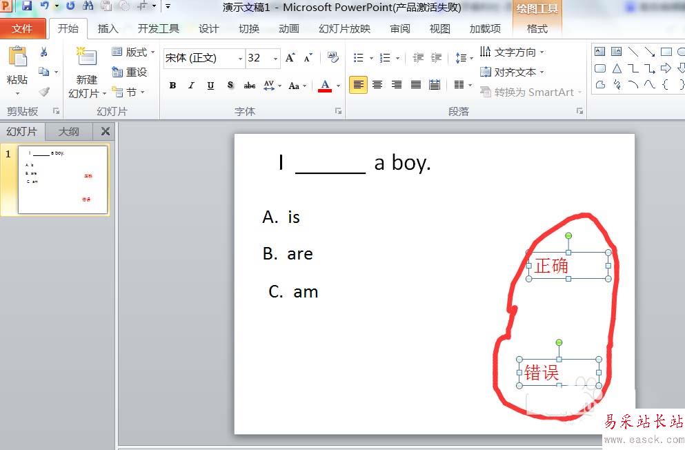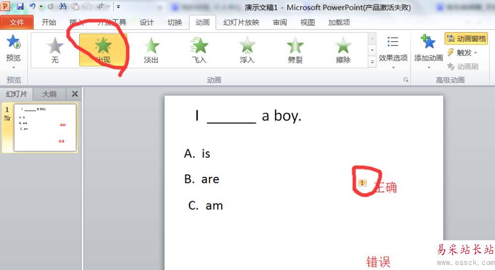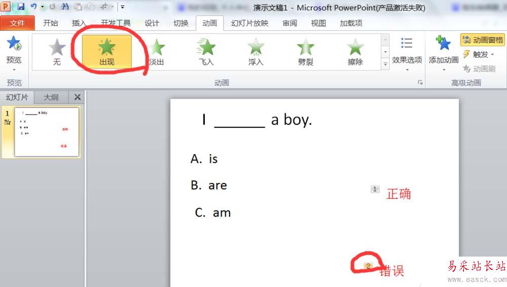 3、重新選擇兩個文本框,編輯內容為“錯誤”和“正確”。然后分別對兩個文本框進行動畫設置為“出現”。