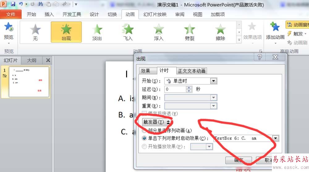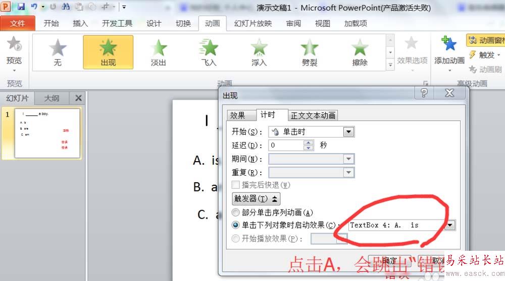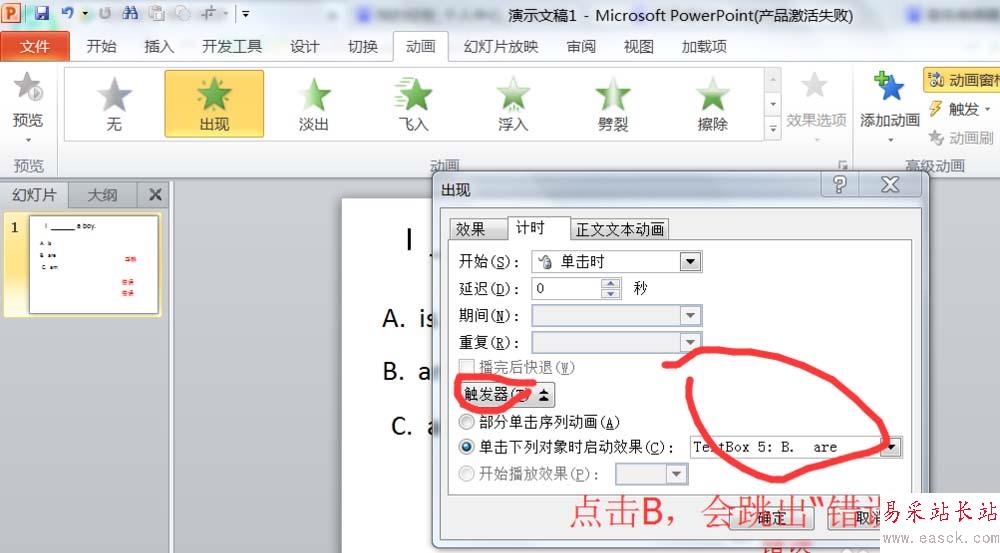 4、對“正確”的文本框設置動畫的觸發器,當點擊C選項,就會觸發動畫效果。對“錯誤”的文本框設置動畫的觸發器,當點擊A選項,就會觸發動畫效果。對“錯誤”的文本框設置動畫的觸發器,當點擊B選項,就會觸發動畫效果。