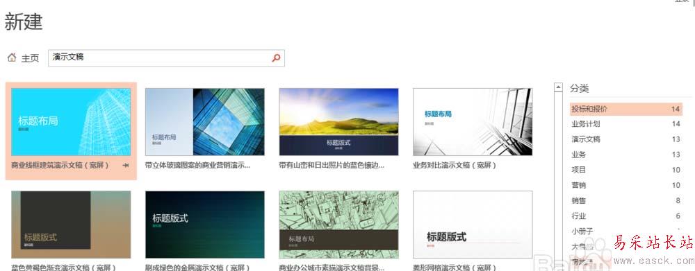 5、新建”演示文稿“PPT提供了很多模版,我們可以從模版庫里挑選自己喜歡的模版