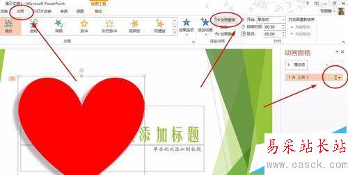 7、點擊【動畫】選項卡下屬的【高級動畫】中的【動畫窗格】,點擊心形后的下拉按鈕