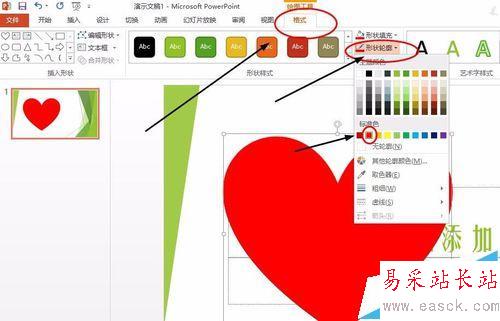 3、在【格式】的【形狀樣式】中,點擊【形狀輪廓】,使心形的輪廓和內心一樣,變成紅色