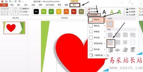 4、在【格式】的【形狀樣式】中,點擊【形狀效果】,選擇【預設】中的第五個,使心形變得更有fell