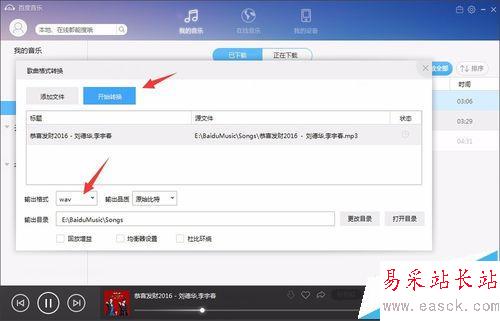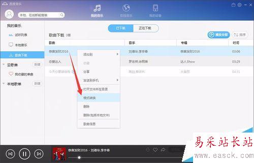 3、用到的轉碼軟件是“百度音樂”,當然你可以看自己的播放軟件能否轉碼。百度音樂,選擇我的音樂-本地音樂或歌曲下載,找到需要的文件,右擊選擇格式轉換,選擇轉換為wav文件。