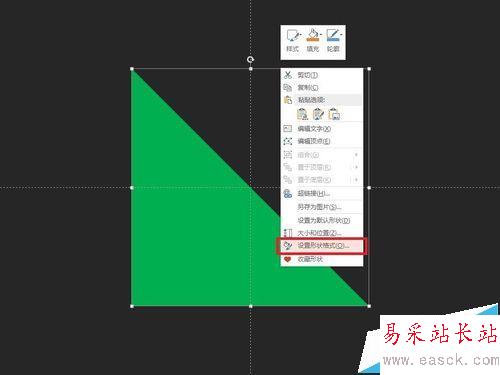 2、插入一個直角三角形,按住Shift鍵繪制等腰直角三角形,在格式菜單下設置其寬高為12厘米。選擇三角形,右鍵點擊設置形狀格式。