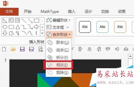 6、選中兩個三角形,點擊格式-插入形狀-合并形狀,選擇相交。