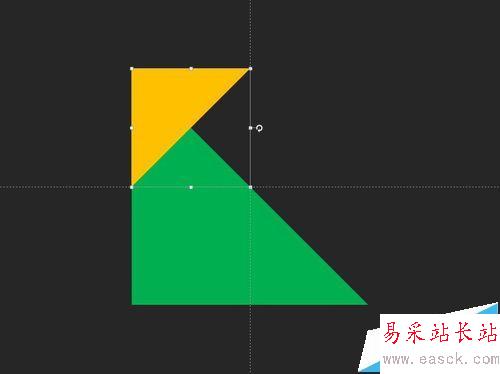 5、按住Shift鍵插入一個等腰直角三角形,寬高為6厘米,為了便于區別,更換為黃色,擺放為下圖所示。