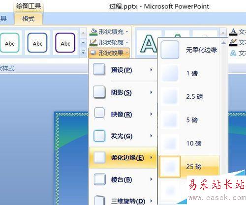 3、再復制一個,填充白色。繪圖工具——格式——形狀效果——柔化邊緣——25磅。與原圖重合,成為高光處。