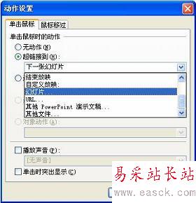 2、在“動作設置”窗口,選擇“單擊鼠標”下的“超鏈接到”,然后單擊右邊的向下箭頭,選擇“幻燈片”,如圖: