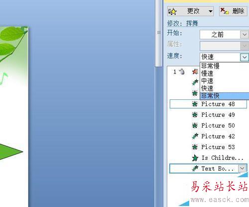 6、同樣,開始選“之前”,但是歌聲中這一句速度是很快的,所以,速度選擇“非常快”。當然,動畫文本選擇的依然是按字母,每一個字母之間延遲50%。
