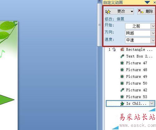3、因為整段話是歌詞的一部分,所以在歌聲開始后隨著每一句歌聲的唱出,同一句歌詞也會跟著出現,所以文本框是以“上一項之后”開始(不可能在整首歌唱完之后再出現),方向選擇跨越,速度中速。