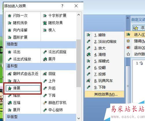 2、點擊第一句話,為它添加效果:自定義動畫面板——添加效果——進入——其他效果——伸展。