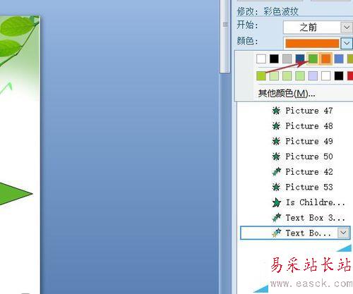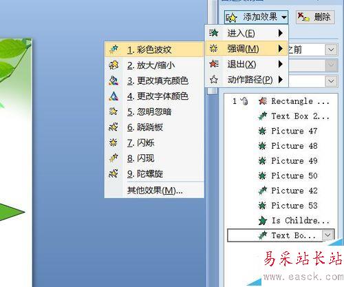 7、依然是這句話,因為我們要對它強調一下,所以,在添加效果中選擇——強調——彩色波紋,以醒目的顏色,進行提醒。
