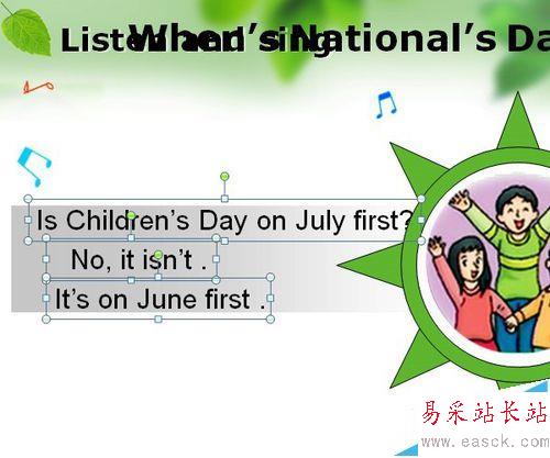 為節日歌曲制作的動畫的一部分。關于兒童節的問答。每一句話以不同的方式出現,表現出活潑的氛圍。文中的動畫很多,本例主要介紹有關文字的制作。
