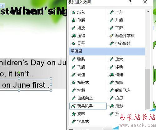 9、強調了“不是”之后,正確答案旋轉著上來,因此,第三句話,為它添加的進入效果是:玩具風車。