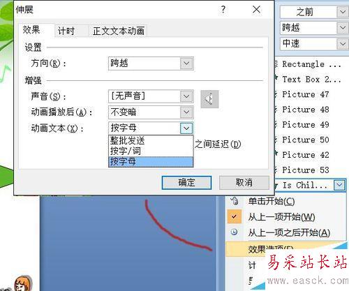 4、效果圖中可以看到每一個字母都在執行這個動畫,這種效果是在效果選項里完成:動畫面板中隊該效果點右鍵——效果選項——動畫文本——按字母。選擇之后,不會再把整句話作為一個對象執行伸展動畫,而是每一個字母都在伸展。