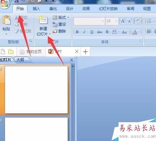 1、新建PPT。在桌面上新建一個PPT,然后新建一個新的幻燈片,在導航欄上就有新建按鈕,直接點擊就可以了。