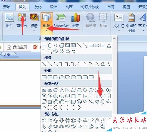 2、插入月牙形狀。點擊導航欄上的插入,找到月牙形狀,這個形狀比較好找,找到后點擊就可以繪畫在空白幻燈片上了。