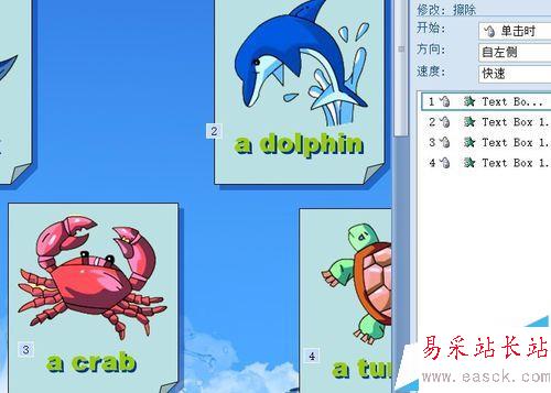 7、自定義動畫面板中,為文本框設(shè)置動畫:添加效果——進入——擦除,開始、方向、速度如圖設(shè)置。然后,復(fù)制三個,更改其中單詞。