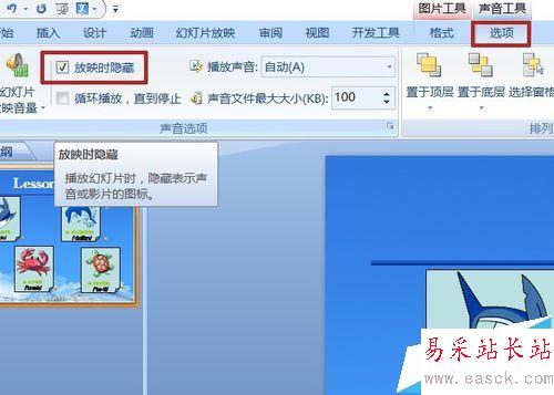 11、選中錄下的聲音圖標(biāo),聲音工具——選項,勾選“放映時隱藏”按鈕。