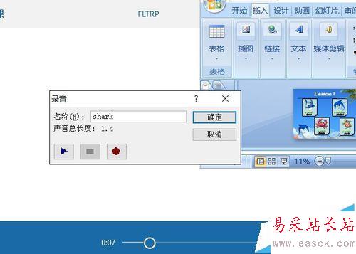 10、為每個單詞錄入讀音。每一篇課文基本都有光盤讀本,打開。然后,在PPT中插入——媒體剪輯——聲音——錄制聲音。在播放器讀到該單詞時點擊圓形錄音鈕,按下中間方形鈕停止錄音,確定后,聲音被錄下。