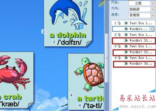12、同樣方法錄入其余三個,開始改為“之前”,分別拖入每個單詞效果的下方。
