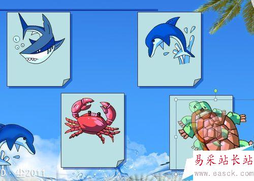 課件是針對海洋生物的學(xué)習(xí),所以整體設(shè)計以水為背景,摳出課本中的圖片或者找到合適的圖片,配上音標(biāo)、錄入聲音,制作一個生詞認讀的課件。