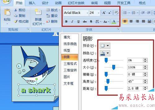 6、插入——文本框——橫排文本框,輸入單詞,字體與陰影設(shè)置如圖。