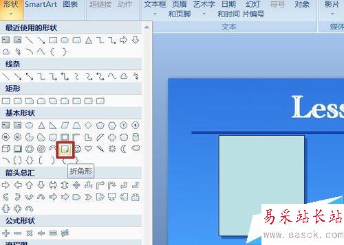 1、首先制作放入單詞的便簽。插入——形狀——基本形狀——折角形。在舞臺的橫線下拉出一個大小合適的折角形。
