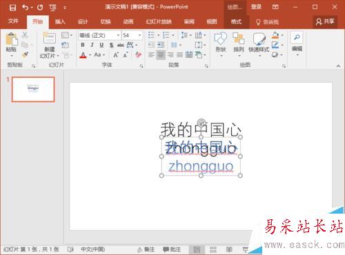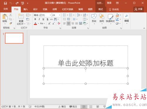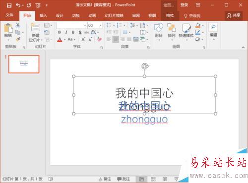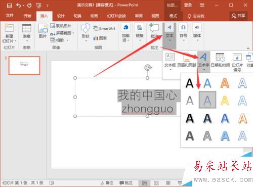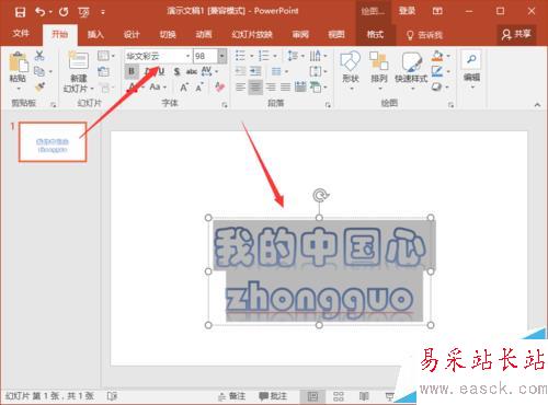 3、返回到PowerPoint中,在編輯區(qū)域我們發(fā)現(xiàn)PPT中多了一個(gè)文本框,這個(gè)是用來(lái)存放藝術(shù)字。選中之前的標(biāo)題文本框,將其刪除。如圖所示;
