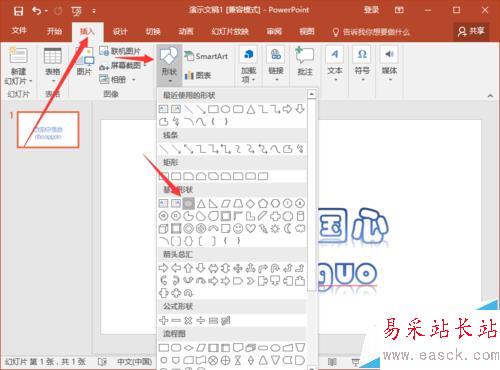 5、字體以及字號(hào)設(shè)置好以后,打開(kāi)“插入”菜單選項(xiàng)卡,依次點(diǎn)擊“形狀”-->“橢圓”形狀。此時(shí)鼠標(biāo)變成十字狀態(tài),按下鍵盤(pán)的Shift鍵,并同時(shí)按下鼠標(biāo),拖動(dòng)鼠標(biāo)來(lái)畫(huà)一個(gè)正圓。這個(gè)圓就是用來(lái)遮蓋文字用的,根據(jù)實(shí)際需要自行調(diào)節(jié)圓的大小以及位置。如圖所示;