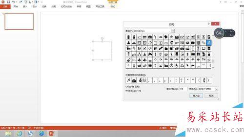 4、字體選擇webdings,這里我們可以看到很多可以用來做圖標的文件,我們可以選擇一個將其插入文本框。