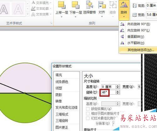 7、原位復制一根,繪圖工具中選擇旋轉——其他旋轉選項,在彈出的面板中將度數改為22.5°。復制第二根,旋轉度數45……依次復制7根。